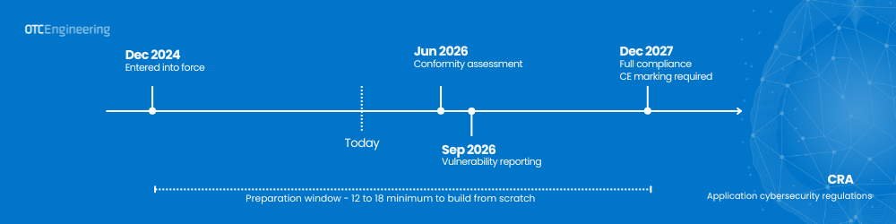 - December 2027 — Full CRA compliance required — CE marking, documentation, conformity assessment